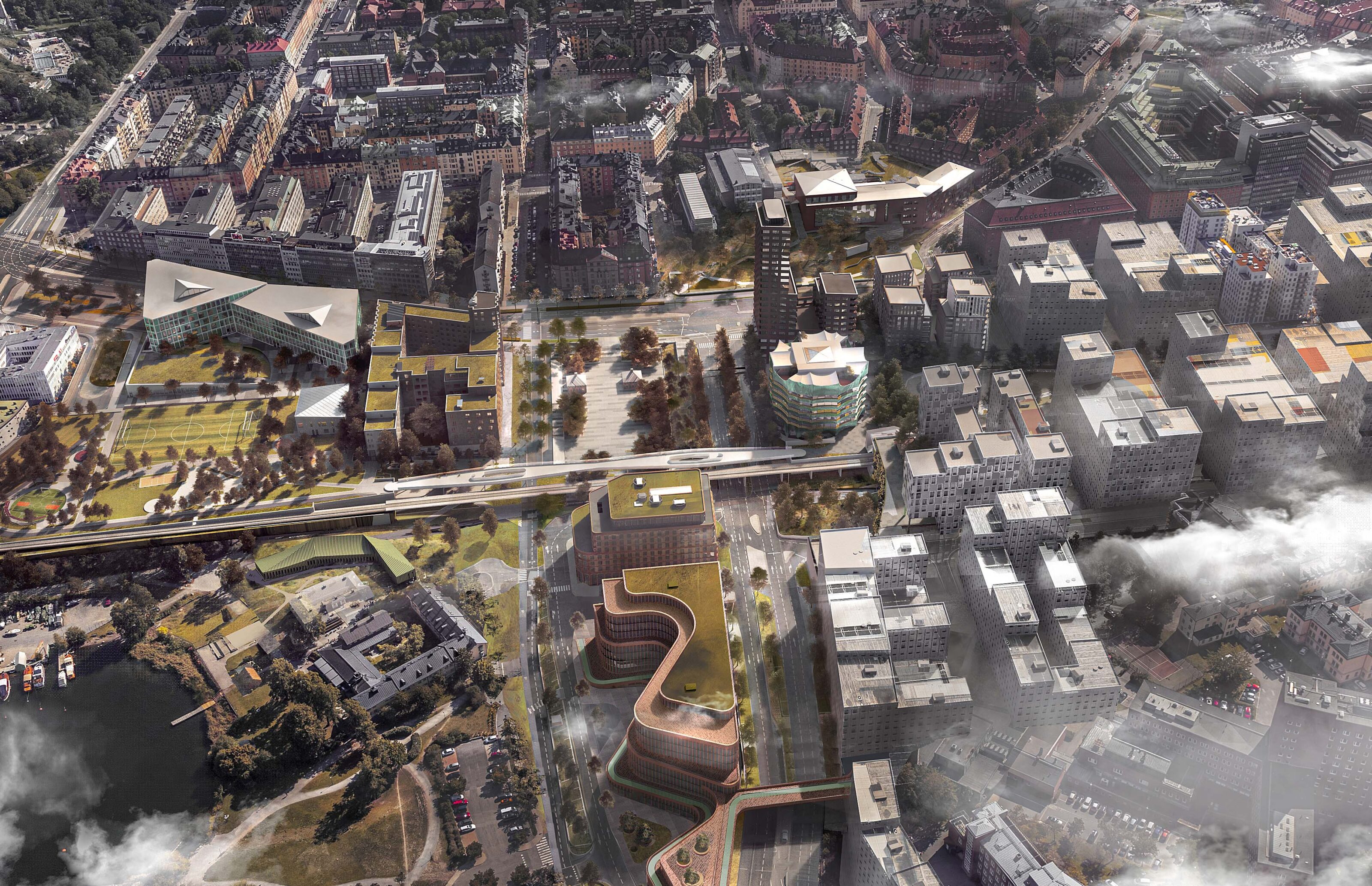 The new plans City of Stockholm has developed for Norrtull and the eastern Hagastaden entail that Stockholm will acquire a new northern entrance to the inner city, provided with a new school, sports facilities, student and elderly housing, a hotel and a new square, as well as many more amenities. Previously characterized by unused land and an abundance of infrastructure, Hagastaden’s transformation into an inner-city district where Stockholm and Solna meet is scheduled to be finished in 2030. The main objective of the council is to remove present barriers and facilitate free movement between neighbourhoods through a dense, vibrant urban environment with connections to the Royal National City Park. Ribosomen, located within the new detailed development plan for eastern Hagastaden, is a new residential scheme, inspired by the classical 19th century urban typology and the iconic brick architecture of Vasastan, designed by architects such as Cyrillus Johansson, Ragnar Östberg and Edvard Bernhard. The project is being developed by Kjellander Sjöberg and Humlegården after winning a competition for the site.