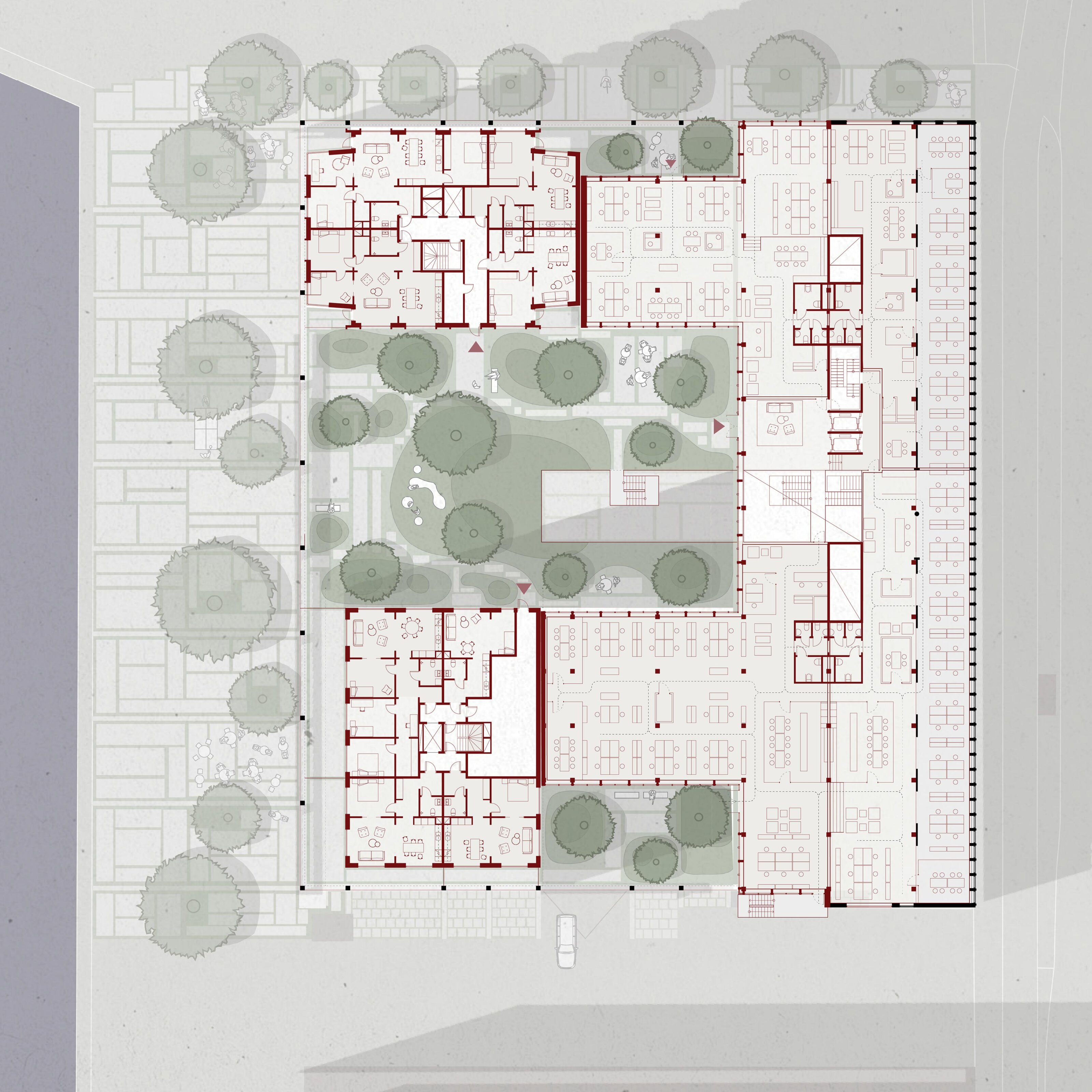 The project aims to create approximately new 100 housing units and 10,000 sqm of office space. New additions are balanced against what is already built, programmatically, structurally and aesthetically. Through analysis of Trollhättan’s cultural and historic significance, and of its tripartite volume, with rational expression and horizontal-vertical structures – the foundation is laid for a transformation and future architectural detailing. Our sustainability strategy is based on what we can use; add as little as possible and preserve building components already in place to a high degree, with minimal added resources, such as new foundations. Added building components have been chosen with care, based on their degree of renewability and low carbon footprint.