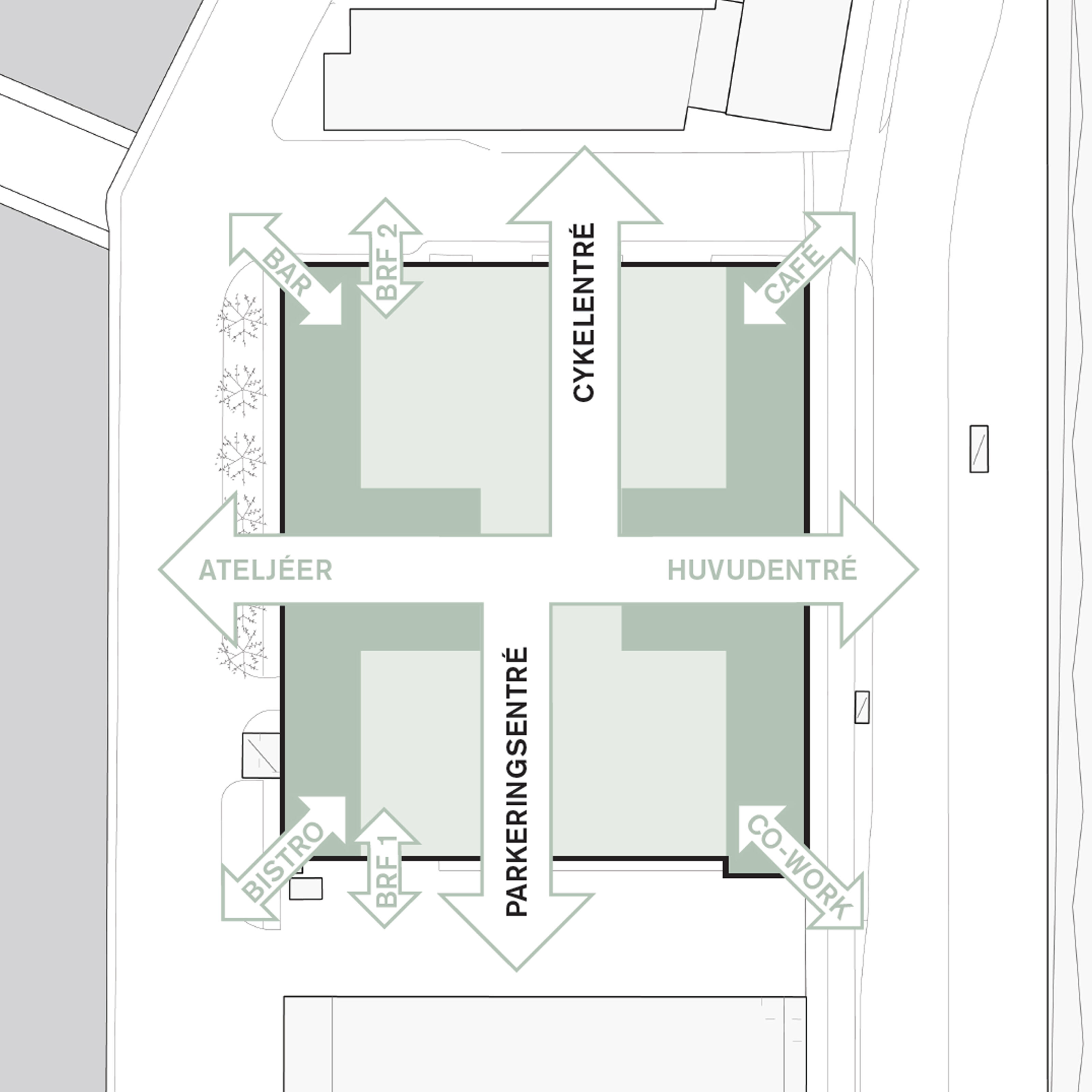 Facing the harbour basin, two individual residential volumes with different heights and floor plans are proposed. An extension and addition to the existing office block responds to Nordenskiöldsgatan’s scale, with setbacks from the existing street façade. A green elevated courtyard on the block’s former parking deck becomes shared for those who live and work on site, with a framed view over the quayside.
