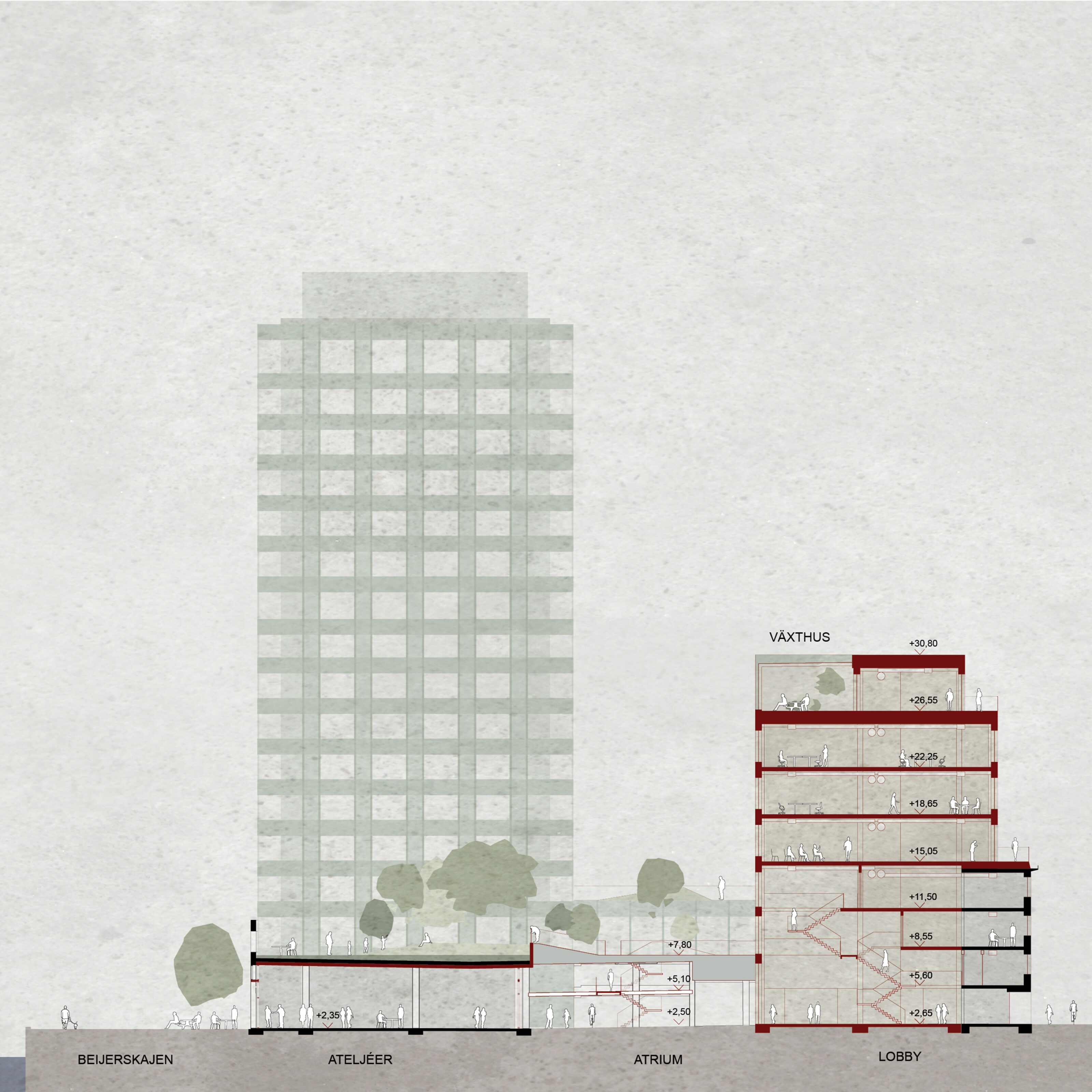 The project aims to create approximately new 100 housing units and 10,000 sqm of office space. New additions are balanced against what is already built, programmatically, structurally and aesthetically. Through analysis of Trollhättan’s cultural and historic significance, and of its tripartite volume, with rational expression and horizontal-vertical structures – the foundation is laid for a transformation and future architectural detailing. Our sustainability strategy is based on what we can use; add as little as possible and preserve building components already in place to a high degree, with minimal added resources, such as new foundations. Added building components have been chosen with care, based on their degree of renewability and low carbon footprint.