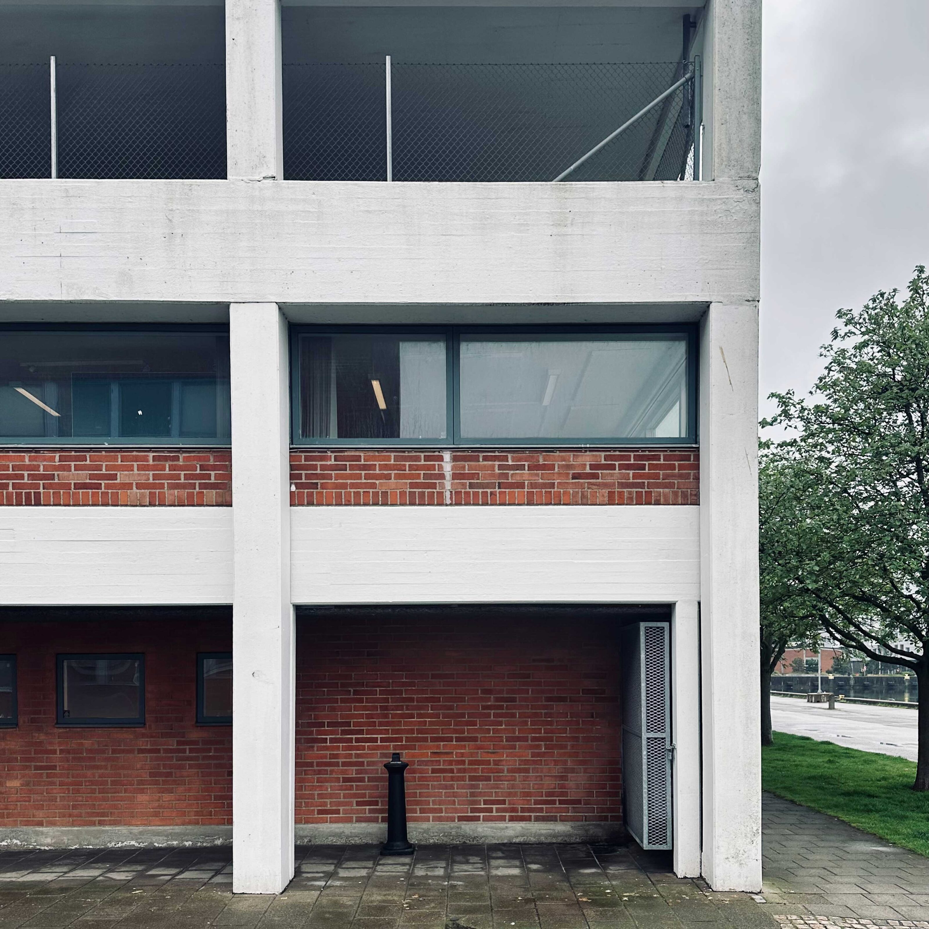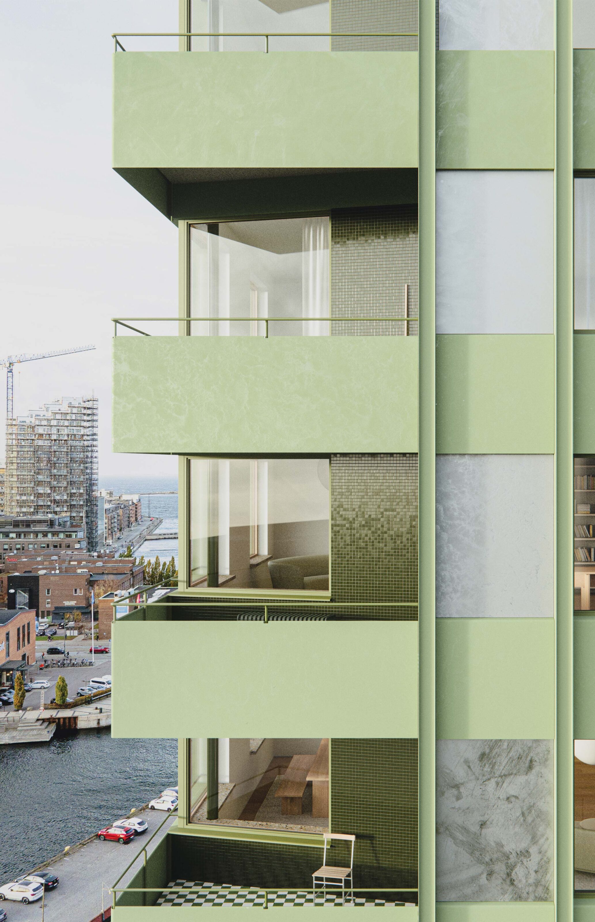The facade design is based on the building volumes’ structural support that is placed on or in the existing structural grid. The three new-build additions are variations on a theme, with shifts in dimensions, material and colour palette. The green colour tones are found on site around the block, in the sea’s shimmer, in weathered green copper sheet, and in long-gone warehouse buildings. The building’s aesthetic becomes a game of ‘Chinese whispers’ with the past, allowing the use of different types of available facade sheets; recycled, corrugated or newly produced smooth ones.